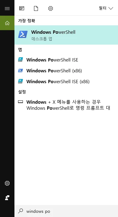 윈도우 10 검색에서 windows powershell을 검색해서 선택합니다.