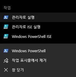 이때에는 아래와 같이 작업표시줄이나 파워셀 실행아이콘 우측 마우스 클릭해서 관리자로 실행해 주시면 됩니다.