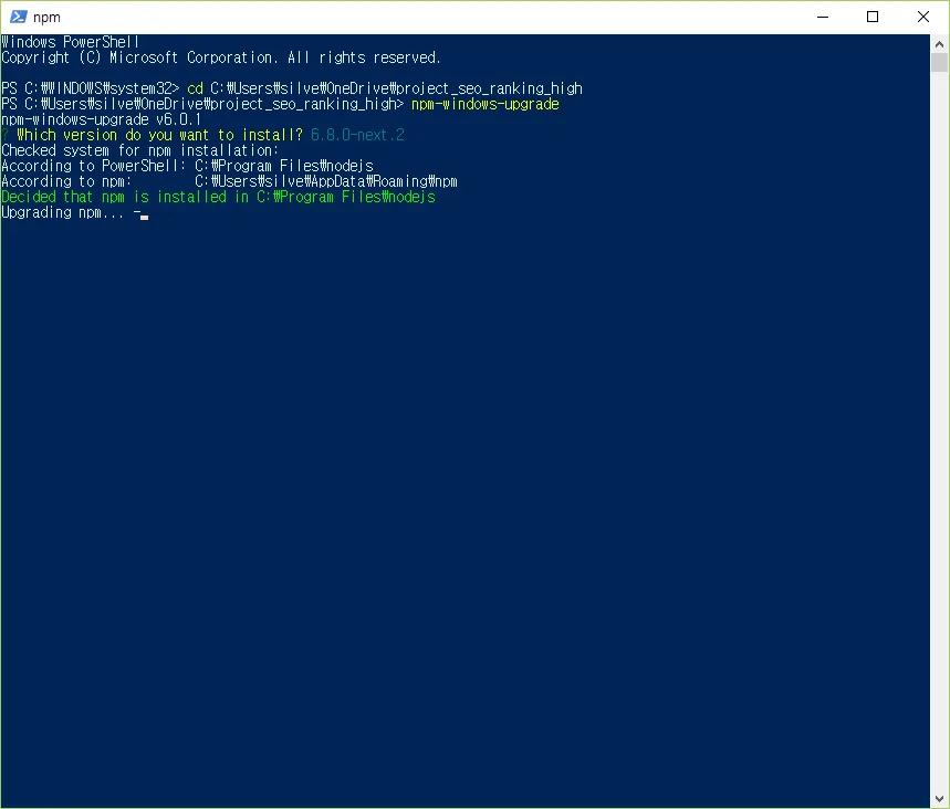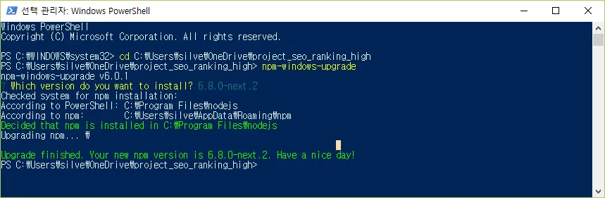 "npm install --global --production npm-windows-upgrade" 입력 후 엔터
