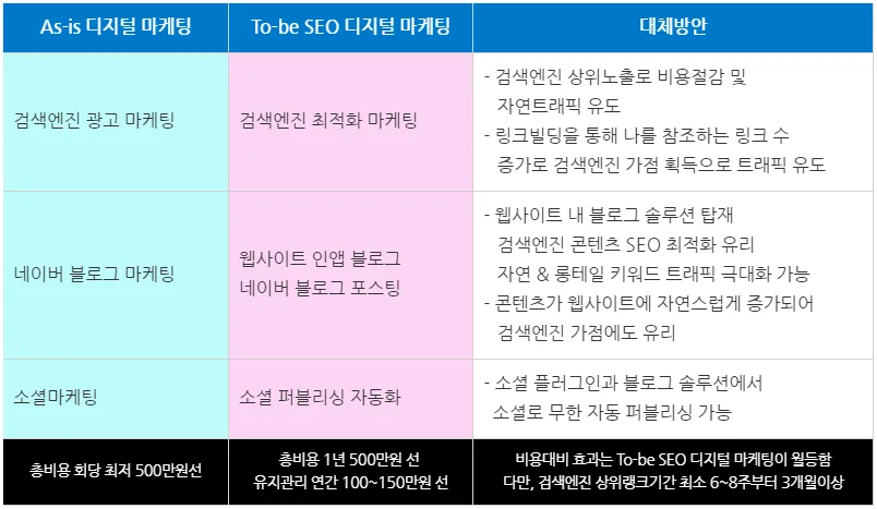 검색엔진 광고 마케팅은 검색엔진 최적화 마케팅(SEO)으로 대체하고 블로그 마케팅은 내 웹사이트에 블로그를 만들어 직접 유입을 늘리고 블로그에서 못하는 직접결제까지 붙여서 결제 단계를 줄여 구매전환율을 높이고 소셜마케팅은 내 콘텐츠를 자동으로 소셜로 확산시키고 이런 마케팅을 하면 어떨까요?