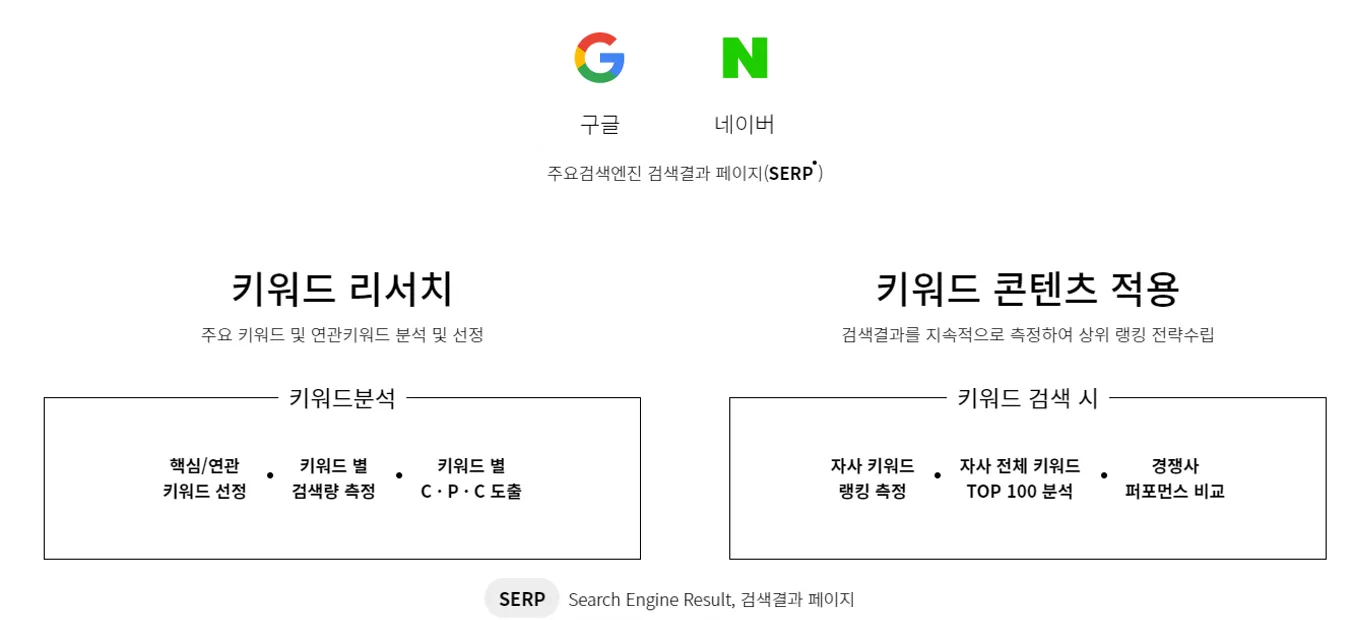키워드 리서치는 주요 포털 사이트의 검색 결과와 자사 및 경쟁사의 키워드를 분석해 핵심 및 연관 키워드를 선정하는 과정입니다.