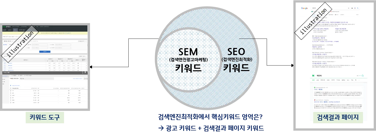 SEO는 핵심 키워드(숏테일키워드)를 우선 시 하지만 SEM(검색엔진광고마케팅)에서 타겟으로 할 수 없는 약 40%에 해당하는 고객 언어인 롱테일키워드(자연언어)도 타겟으로 합니다.