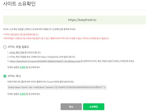 HTML 태그나 HTML 파일 업로드 방법 중 하나를 선택하여 소유 확인을 할 수 있습니다. HTML 태그는 사이트의 <head> 영역에 넣고 확인합니다.