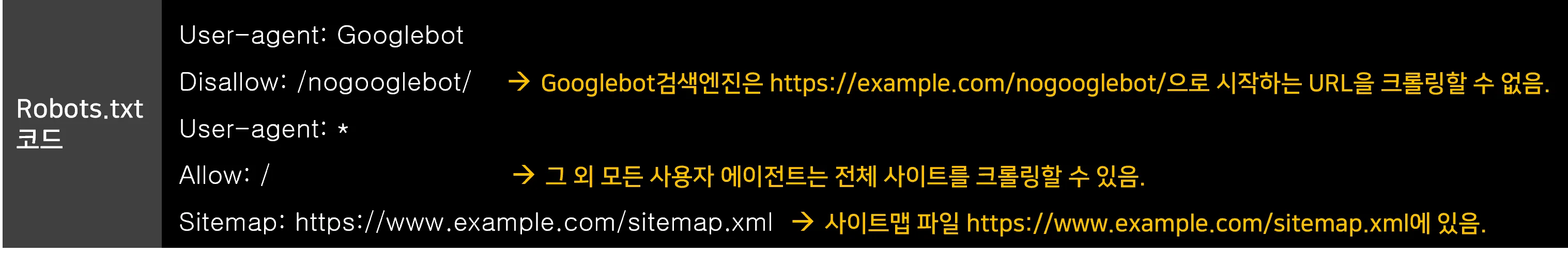 - 크롤러가 접근할 수 있는 페이지를 제한하거나 허용할 수 있습니다.