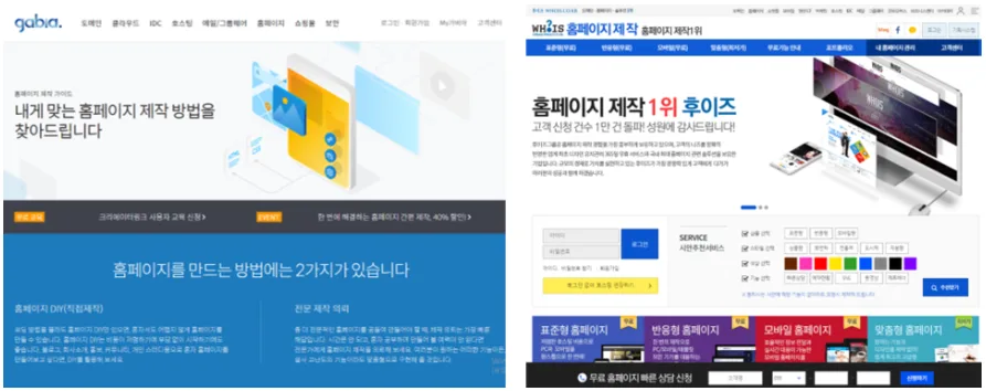 가비아, 후이즈 처럼 도메인판매와 호스팅서비스를 위주로 하다가 고객이 많이 몰리다 보니 웹사이트를 제작하게 되었고 관공서까지 진출 하게 되었습니다. 주로 공공이나 중저가 웹사이트 제작을 합니다. 워드프레스와 같은 자동화 도구를 자동세팅을 해주기도 해서 자동화 도구 영역과 겹치기도 합니다. 디자인 전문성은 낮아서 포트폴리오를 보시면 비슷한 디자인 퀄리티를 보여주고 있습니다. 대량으로 중저가 시장을 공략하다보니 SMS, 실시간 채팅, 결제 등 다양한 웹사이트 도구를 낮은 가격에 제공해 준다는 것이 장점이어서 간단한 중소상공인 홍보용 제작으로 많이 사용됩니다. 그 중 중저가 쇼핑몰에 특화된 호스팅사가 고도몰이나 메이크샵 같은 곳이 있습니다. 쇼핑몰은 복잡해서 솔루션을 보유하고 있는 회사에서 하는 것이 좋습니다. 가격은 전문 웹에이전시와 자동화 도구의 중간 쯤에 해당합니다.