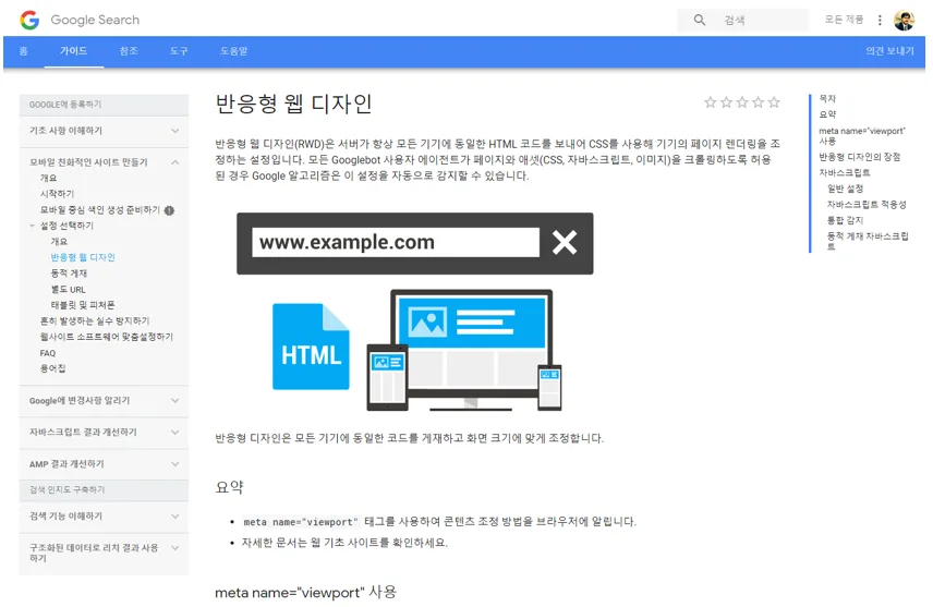 구글은 다음 사이트와 같이 반응형웹으로 웹사이트를 제작하라고 지침까지 알려주고 있습니다.