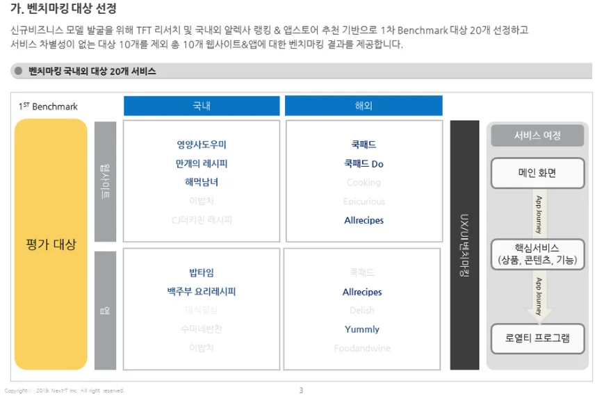 뭐 이런 결론이 나왔다고 가정해 보겠습니다. 그럼, 현재 디지털상에 레시피 관련 서비스를 하고 있는 서비스들을 대상으로 벤치마킹을 합니다. 벤치마킹을 할 때에는 글로벌 랭킹, 국내랭킹 등을 고려해서 웹사이트/ 앱 등 다양한 채널까지 참고 해야합니다.