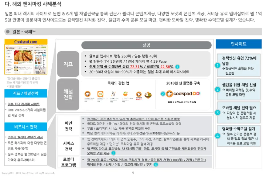 채널 전략 부분은 쿡패드라는 서비스가 다양한 웹&앱으로 채널다양화를 한 것을 알 수 있습니다.