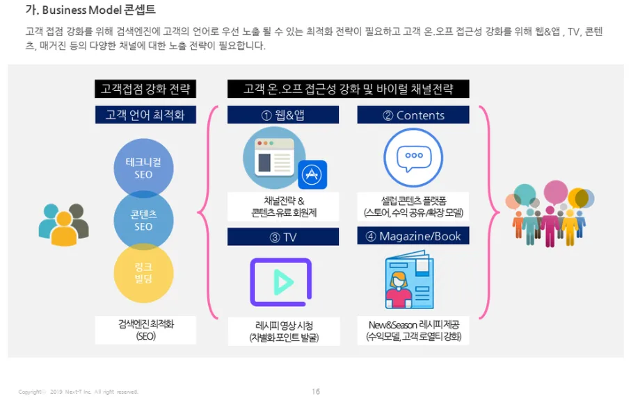 위와 같이 잘 하는 레시피 앱/웹들의 공통점이 고객언어이자 최초 접접인 검색엔진 최적화가 되어 있고 고객의 온.오프 접근성을 최적화하기 위해 웹&앱, 콘텐츠, TV(동영상), 매거진/책 등 다양한 채널전략을 통해 고객들에게 편하게 접근하고 있다는 것입니다.