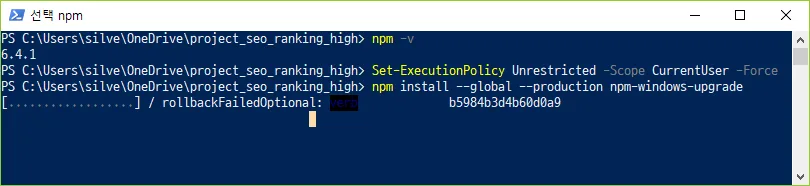 "npm install --global --production npm-windows-upgrade" 입력 후 엔터
