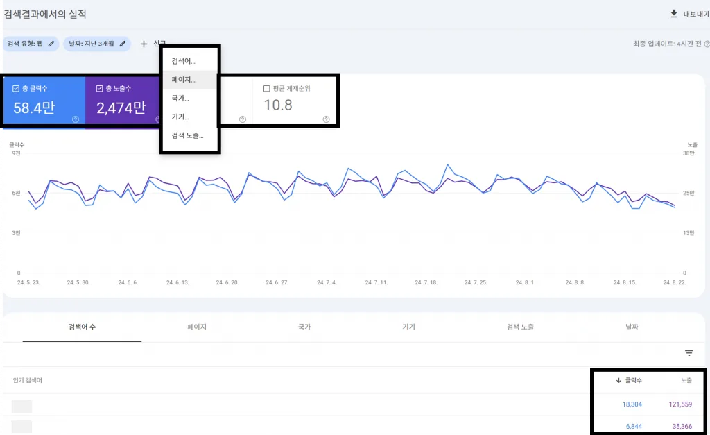 SEO 성과를 평가하기 위해서는 몇 가지 주요 지표를 모니터링해야 합니다. 트래픽은 웹사이트 방문자 수를 측정하는 기본 지표로, SEO 전략이 얼마나 효과적으로 작동하고 있는지 보여줍니다. 전환율은 웹사이트 방문자가 실제로 목표로 하는 행동(예: 구매, 회원 가입 등)을 완료한 비율을 나타내며, SEO 성과가 비즈니스 목표와 얼마나 연결되는지 평가하는 데 중요한 역할을 합니다. 키워드 랭킹 분석은 특정 키워드에 대해 웹사이트가 검색 엔진에서 얼마나 높은 순위에 위치 하는 지를 보여줍니다. 이 지표 들을 종합적으로 분석하여 SEO 전략의 성공 여부를 판단할 수 있습니다. 아래는 구글 서치콘솔에서 제공하는 총 클릭수와 총 노출수의 관계를 나타내는 그래프입니다.