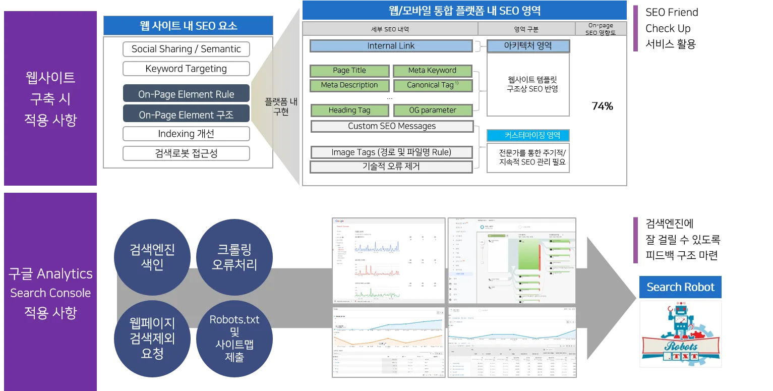 웹사이트 구축 시 SEO가 적용 될 수 있도록 SEO Friend Check up 서비스를 통해 Meta Title,Descrition 등 HTML 항목 검수를 제공하고 구글 Analytics Search Console을 통해 색인 및 오류 처리 등 다양한 작업을 진행해야합니다.