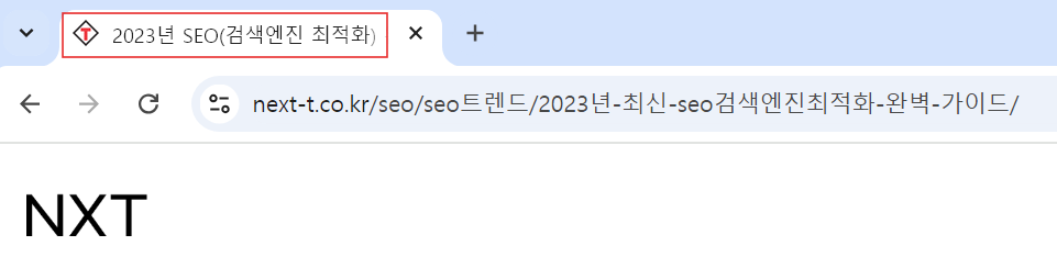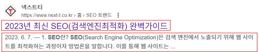 검색결과에서 제목을 주로 페이지 제목 즉, meta title이 노출되고 이는 브라우저탭에서 보이는 텍스트와 같습니다.