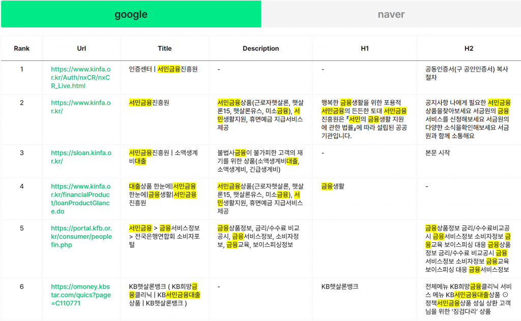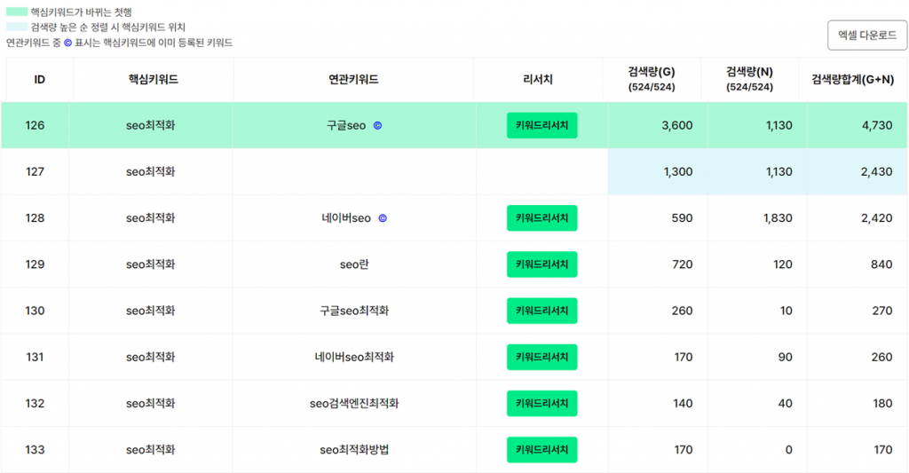 다음은 핵심키워드로 구글/네이버/유튜브 키워드를 조사하여 고객관점의 키워드를 선택한 리서치 결과물입니다.