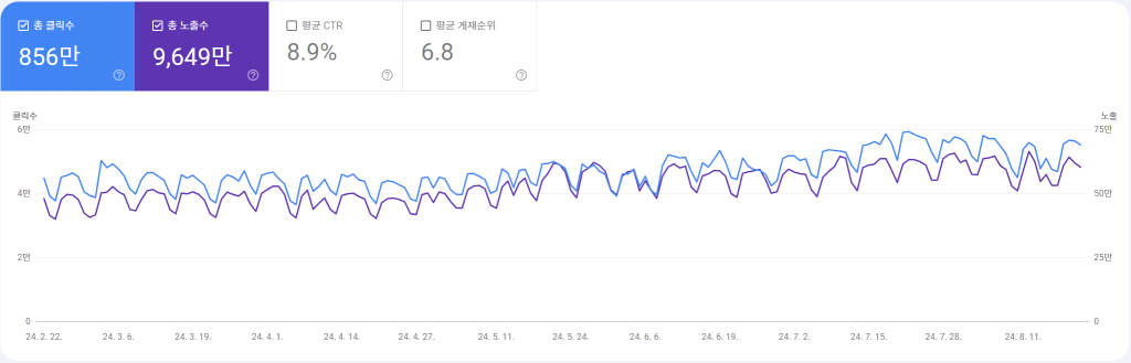 SEO 성과를 평가하기 위해서는 몇 가지 주요 지표를 모니터링해야 합니다. 트래픽은 웹사이트 방문자 수를 측정하는 기본 지표로, SEO 전략이 얼마나 효과적으로 작동하고 있는지 보여줍니다. 전환율은 웹사이트 방문자가 실제로 목표로 하는 행동(예: 구매, 회원 가입 등)을 완료한 비율을 나타내며, SEO 성과가 비즈니스 목표와 얼마나 연결되는지 평가하는 데 중요한 역할을 합니다. 키워드 랭킹 분석은 특정 키워드에 대해 웹사이트가 검색 엔진에서 얼마나 높은 순위에 위치 하는 지를 보여줍니다. 이 지표 들을 종합적으로 분석하여 SEO 전략의 성공 여부를 판단할 수 있습니다. 아래는 구글 서치콘솔에서 제공하는 총 클릭수와 총 노출수의 관계를 나타내는 그래프입니다.