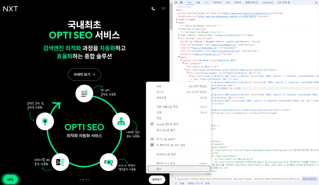메타설명은 다음과 같이 브라우저에서 오른쪽 마우스 클릭 후 나오는 제일 밑 메뉴인 검사라는 항목 클릭 시 보여지는 요소(소스)에서 찾을 수 있습니다. html 소스가 보이면 마우스로 소스를 한번 클릭 한 후 Ctrl +F 로 “description”을 검색해 보세요.